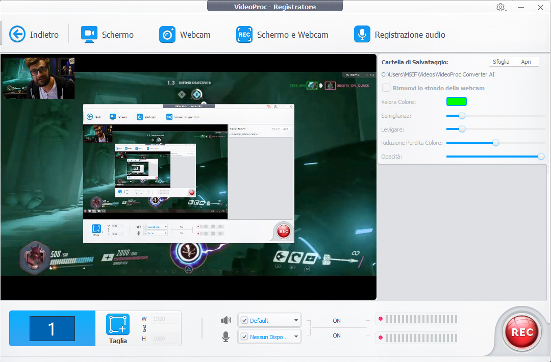 Con VideoProc Converter AI puoi registrare i gameplay, presentazioni, webinar, chiamate su Skype, eventi in diretta e podcast. Un unico strumento che ti permette di fare tutto. Ti permette di registrare video picture-in-picture in modo diretto e video con green screen per cambiare lo sfondo durante la registrazione, senza bisogno di modifiche in post, cattura anche i suoni del sistema e la voce.