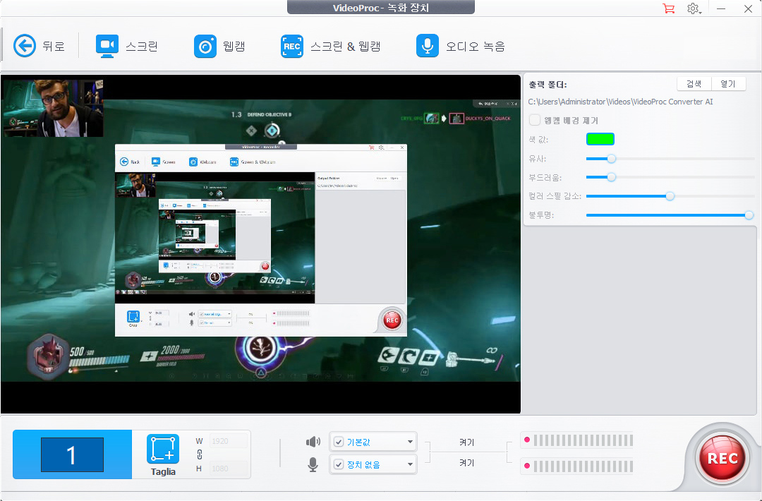 게이머, 스포츠 애호가, 교육자, YouTube/TikTok 인플루언서를 위한 VideoProc Converter AI는 화면 녹화기, 웹캠 녹화기, 오디오 녹화기 소프트웨어입니다. 게임 플레이, 프레젠테이션, 웨비나, Skype 통화, 라이브 스트림을 녹화하고, vlog, 스크린캐스트, 팟캐스트, 온라인 과정, 제품 리뷰, 비디오 지침을 만드는 데 도움이 됩니다. 화면 속 화면 비디오를 직접 녹화하고, 사후 처리 없이 녹화하는 동안 배경을 변경하기 위해 그린 스크린 비디오를 녹화하고, 시스템 사운드와 음성을 캡처할 수 있습니다.