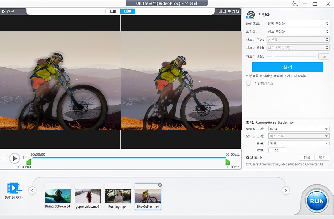 AI 동영상 안정화는 고프로, DJI, HD 카메라, 스마트폰에 상관 없이 흔들린 영상을 보정해 줄 것입니다. 모든 사용 용도에 가능한 흠 잡을 데 없는 결과를 보장하며 사용자 맞춤 안정화 모드 및 자르기 비율을 통해 정확성, 화질, 속도에 대한 컨트롤이 가능해 집니다.