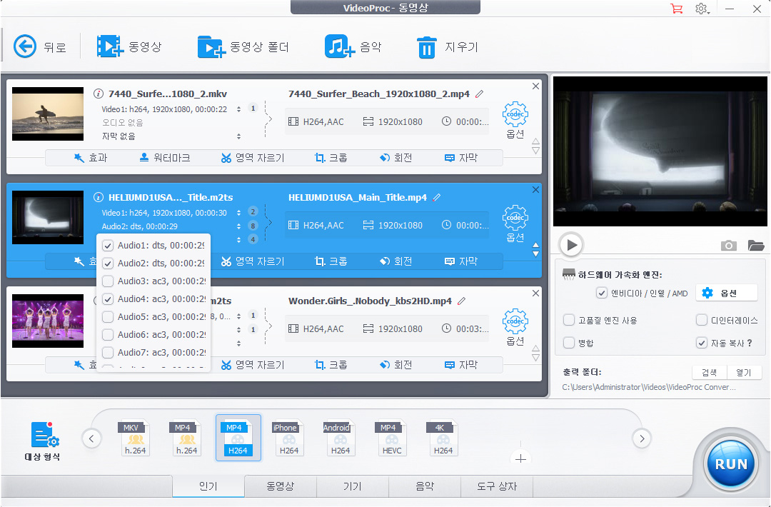 A-B 비디오 변환: 370개의 입력 코덱과 420개 이상의 출력 형식을 포함하는 흠잡을 데 없는 4K 지원 비디오 컨버터는 H264에서 H265(HEVC), MKV에서 iPhone로, GIF에서 MP4, AVI에서 YouTube로, 3D에서 2D로 모든 단순하고 복잡한 트랜스코딩 요구를 모두 만족시킵니다. See the Full Supported Formats >>