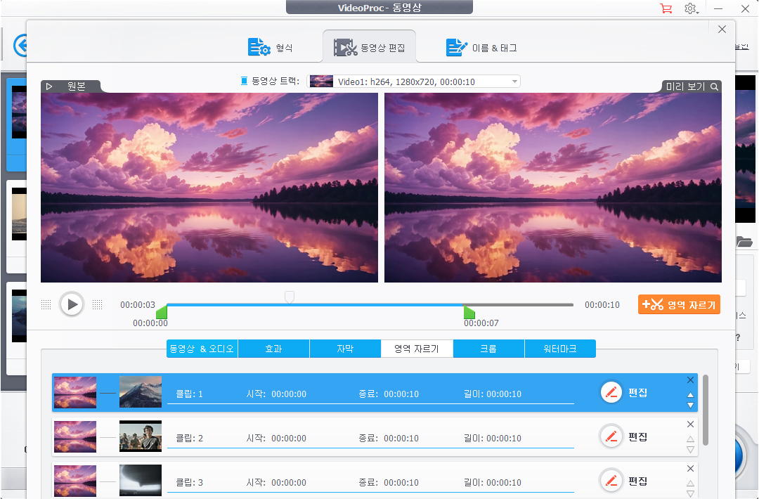 회전/뒤집기자르기는 비디오 편집에서 매우 흔한 작업입니다. 자르기를 통해 비디오를 줄이고, 원하지 않는 부분을 잘라 내고, 클립을 새로운 순서로 재정렬하고, YouTube용 파일 크기를 줄일 수 있습니다. 비디오프록 컨버터 AI에서 '자르기'는 매우 유연하며 다른 편집 작업과 함께 사용할 수 있습니다.